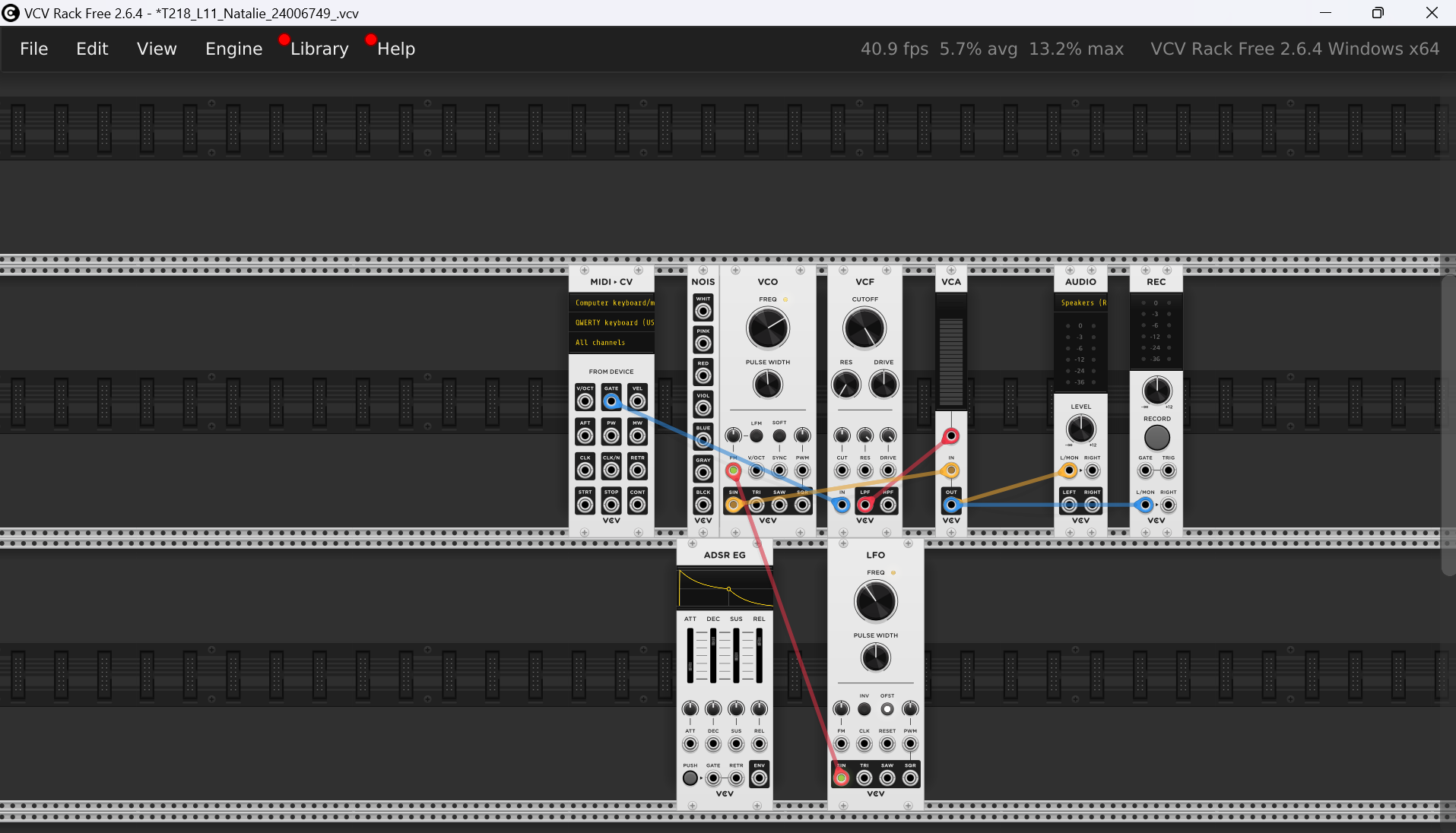 The patch creates sound by pressing on the keyboard presses into pitch through the MIDI-CV module, which tells the VCO what note to play. The VCO generates the raw tone, and the VCF shapes it by adjusting how bright or smooth it sounds, with the LFO adding little movements to make it feel more alive. The ADSR controls how the sound enters and fades, giving each note a natural shape, while the VCA handles the overall loudness. Everything then flows into the Audio module so I can hear it, and the REC module lets me record what I created.